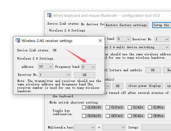 All receivers are numbered 1 by default. If you need to use the second one, set the second dongle number to 2. When using it, use the shortcut key ctrl+alt+shift+2 to switch to the second receiver.